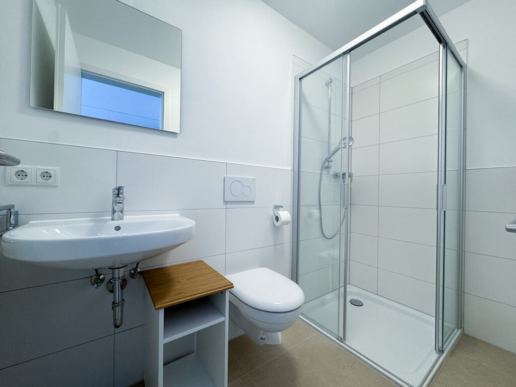 • Bad mit WC, Waschbecken, Dusche und Handtuchheizkörper, barrierefrei